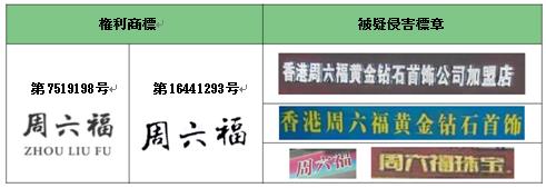 原審の両被告(中百珠寶首飾行と陳埭鎮周六福珠寶店)はその店舗の內裝壁、店舗看板、ショーケース、化粧箱、広告看板、包裝袋、品質保証書などの多くの個所で上述の被疑侵害標章を使用したが、その抗弁理由は次のとおりである。第1にこのような使用方式はフランチャイザーの企業名に対する合理的な使用であり、商標としての使用行為ではない。第2にフランチャイザーは先使用権を有する。一審判決では「周六福」の「」、「」などの被疑侵害標章の過度な使用が商標権侵害行為を構成することが認定されたが、過度とは言えない「周六福」の「香港周六福黃金鑽石首飾公司加盟店」の使用は不正競爭行為を構成することが認定された。原審の両被告は上訴を提起し、二審では一審判決のうち不正競爭行為に関する認定が取り消された。その理由は両被告に主観的な悪意がなく、「関連公衆の誤認?混同をもたらすのに十分である」ことを証明する証拠がなく、不正競爭行為を構成しないことであった。周六福珠寶股份有限公司(「周六福珠寶公司」)の再審の申立てを経て、福建省高級人民法院は(2021)閩民再250號、(2021)閩民再253號民事判決において次の內容を認定した。(1)「」、「 」商標はすでに比較的高い知名度があり、原審の両被告は同業競合者として合理的に回避しなければならない。(2)被疑侵害標章の「 」において、「周六福」には最も識別性と顕著性があるが、その香港の會社の屋號は権利者の登録商標の文字部分と完全に同じであり、雙方の事業內容に重複が存在する狀況の下で、このような使用方式は誤認?混同をもたらすのに十分であることから、不正競爭を構成する。(3)原審の両被告には後に取得した経営権について先使用の抗弁を主張する権利はない。(4)原審の両被告が立証した著作権登記日は権利者の商標登録出願日より遅いことから、先行著作権を証明することはできない。(5)最高人民法院の司法精神に基づき、域外で登録された企業名により大陸で経営活動を行うにあたり、域外の企業名などの商用利用の標章を使用する場合はすべて大陸の法律に従い、すでに大陸で法的保護を受けている先行権利を合理的に回避する必要がある。したがって原審の両被告はこれを根拠として権利侵害責任の免除を受けることはできないが、権利侵害責任を負った後に契約の取決めに基づきフランチャイザーに権利を主張することができる。