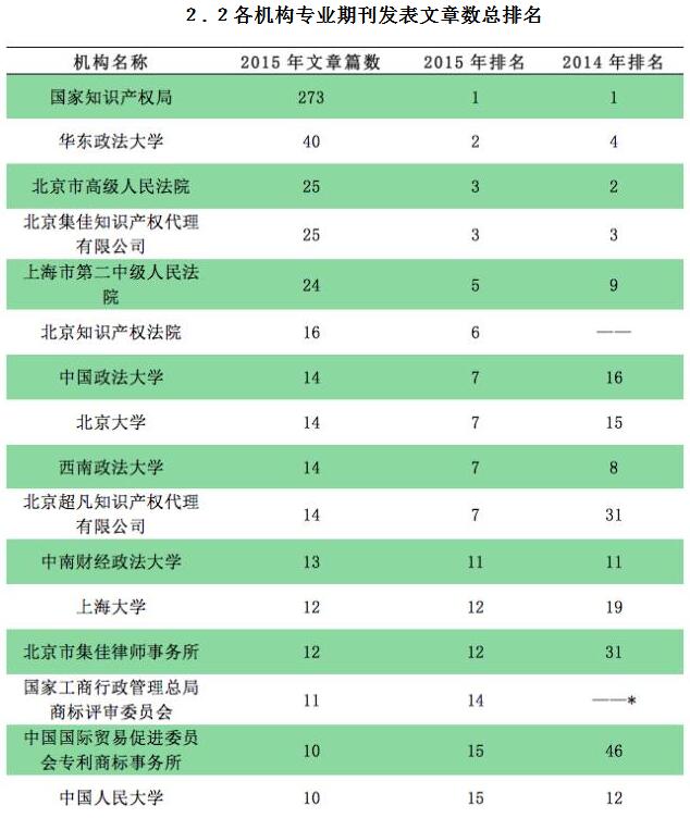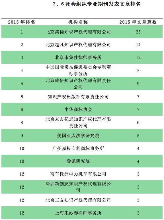 日前,上海知識產權研究所對2015年度我國知識產權專業文章發表情況進行了統計分析,在包括科研院所、司法系統、政府部門、社會組織等各機構文章發表總量排名中,集佳緊隨國家知識產權局、華東政法大學、北京市高級人民法院,以全年發表量25篇的成績,領跑社會組織類機構。此外,北京市集佳律師事務所以全年發表12篇的成績在社會組織類機構排名中名列第三。