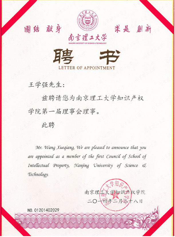 2月28日,由工業(yè)和信息化部、國家知識產(chǎn)權局和江蘇省人民政府共建的南京理工大學知識產(chǎn)權學院,在南京揭牌并成立首屆理事會。在理事會成立大會上,集佳合伙人王學強受聘為第一屆理事會理事。
