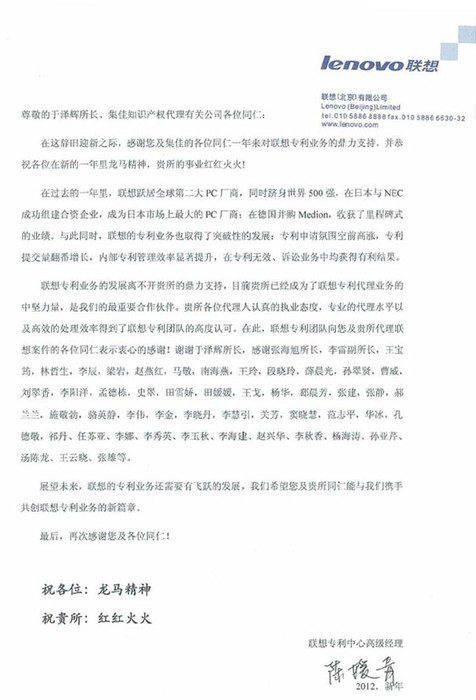 在新年即將到來之際,集佳收到聯想公司專利中心發來的新年感謝信,對集佳在專利工作上給予的大力支持表示感謝。在此,也感謝廣大客戶一直以來對集佳工作的信任與支持,今后我們將為企業提供更加專業和優質的知識產權服務。