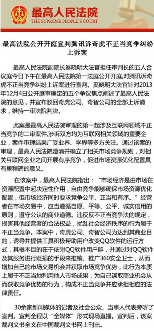 由北京市集佳律師事務所張亞洲律師、周丹丹律師代理的騰訊訴奇虎不正當競爭一案二審,于2014年2月24日下午,由最高人民法院副院長奚曉明大法官擔任審判長的五人合議庭在第一法庭公開開庭宣判,宣布駁回奇虎公司、奇智公司的全部上訴請求,維持一審法院判決。