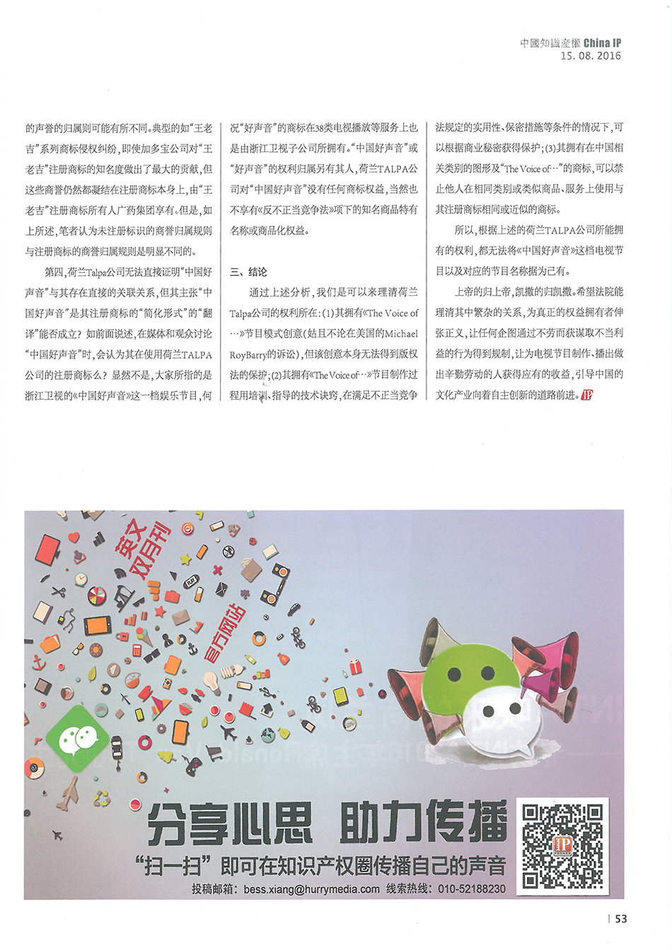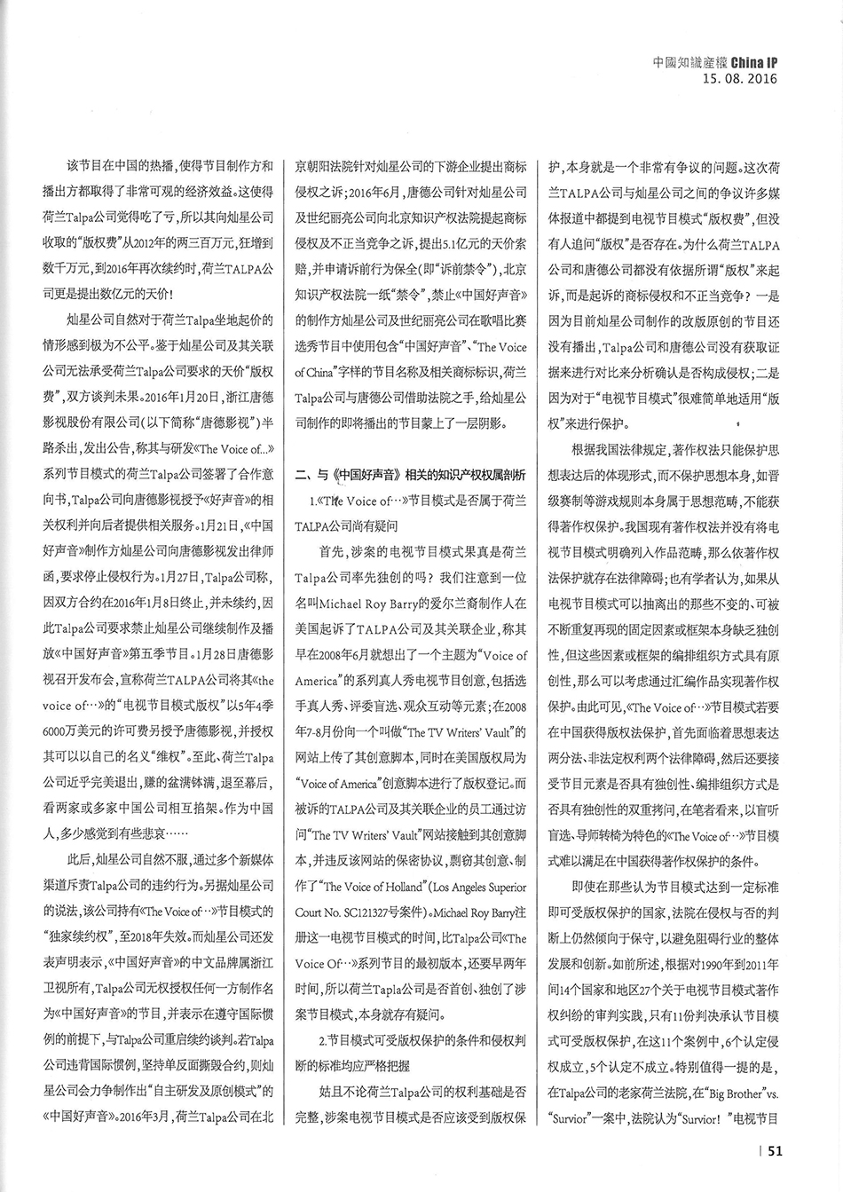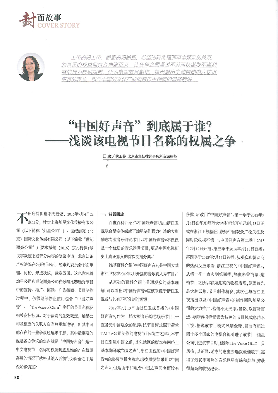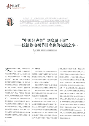 集佳資深律師侯玉靜文章《“中國(guó)好聲音”到底屬于誰(shuí)?——淺談該電視節(jié)目名稱的權(quán)屬之爭(zhēng)》在《中國(guó)知識(shí)產(chǎn)權(quán)》發(fā)表