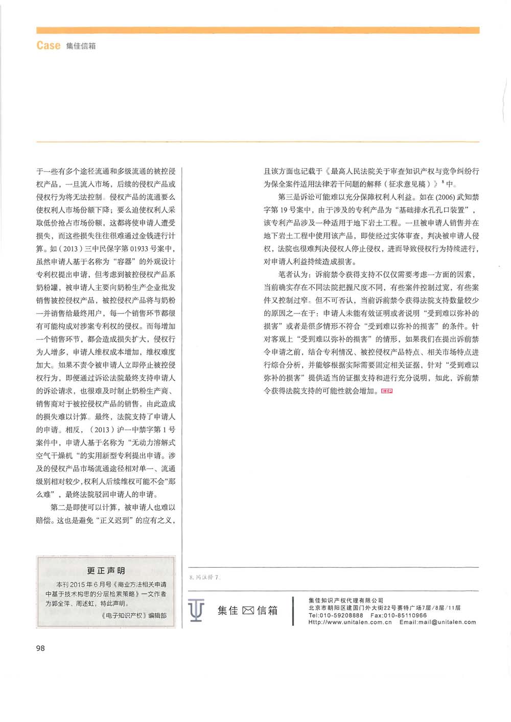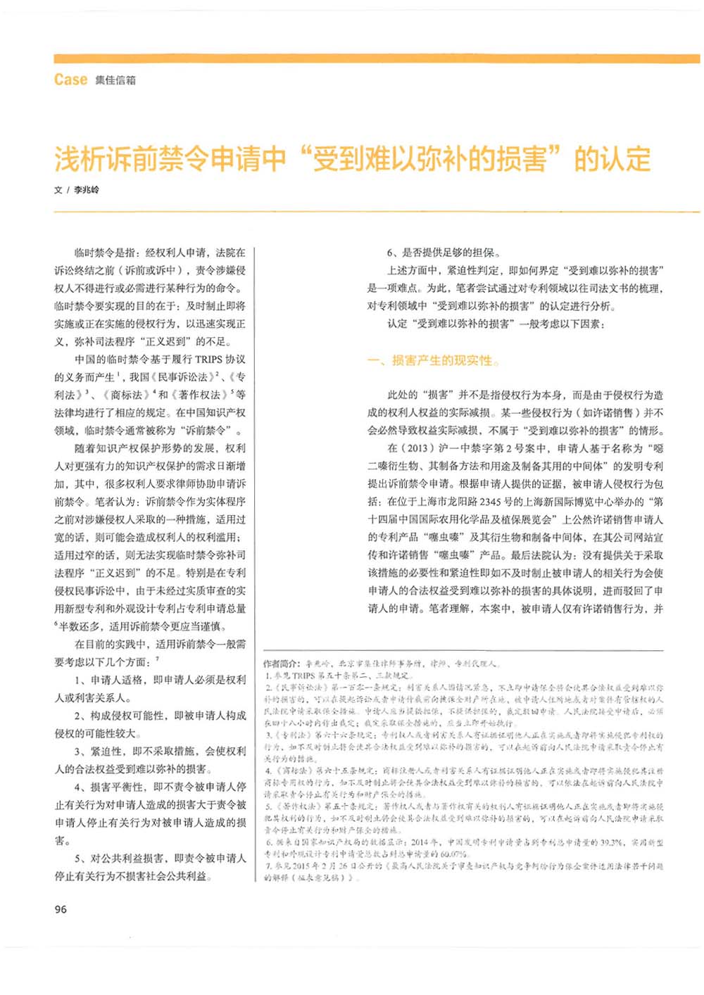 集佳律師文章《淺析訴前禁令申請(qǐng)中“受到難以彌補(bǔ)的損害”的認(rèn)定》在《電子知識(shí)產(chǎn)權(quán)》發(fā)表