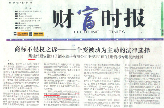 《財富時報》、《今日財富報》:集佳代理口子酒不侵犯“福”注冊商標專用權案