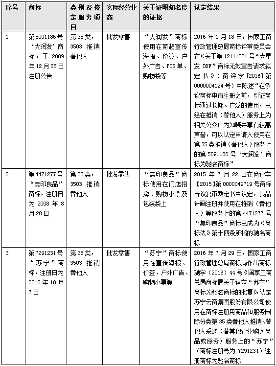 另外,即使在商標(biāo)授權(quán)確權(quán)程序中,對(duì)一些案件的裁判結(jié)果與固有的“批發(fā)零售和推銷替他人不相同不類似”認(rèn)知也相左,以下列舉“大潤(rùn)發(fā)”、“無(wú)印良品”和“蘇寧”三個(gè)行政認(rèn)定馳名商標(biāo)案件為例予以說(shuō)明。“大潤(rùn)發(fā)”是知名的連鎖超市品牌,其權(quán)利人在2009年12月在第35類第3503類似群“推銷(替他人)”服務(wù)項(xiàng)目上注冊(cè)第5091186號(hào)“大潤(rùn)發(fā)”商標(biāo),后在批發(fā)零售業(yè)態(tài)上進(jìn)行了大量使用,2015年基于在批發(fā)零售上使用形成的知名度,第5091186號(hào)“大潤(rùn)發(fā)”商標(biāo)被認(rèn)定為上海市著名商標(biāo),2016年該商標(biāo)被原國(guó)家工商總局商評(píng)委認(rèn)定為馳名商標(biāo)。除此之外,類似情形的還有無(wú)印良品和蘇寧兩案。