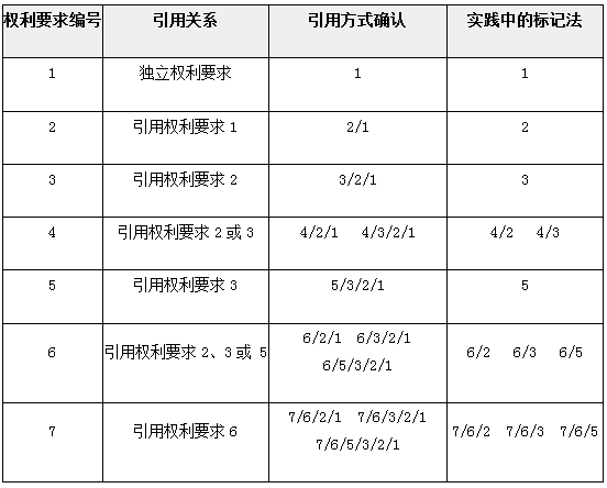 在上表中給出的權(quán)利要求引用關(guān)系中,在判斷時(shí)每個權(quán)利要求的每個方案都必須單獨(dú)被對待。對于其中存在的多項(xiàng)引用權(quán)利要求(上表中的權(quán)利要求4、6和7),當(dāng)其接到拒絕理由、限制要求或?qū)彶閱T的其他要求或意見時(shí),可僅針對單個權(quán)利要求提出。例如,對于權(quán)利要求4引用權(quán)利要求2的方案、權(quán)利要求4引用權(quán)利要求3的方案,當(dāng)遇到反對理由時(shí),可僅在反對理由中針對權(quán)利要求4提出。