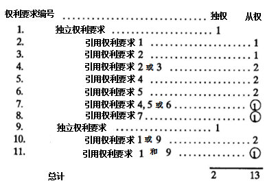 在上面例子中,權(quán)利要求1和9是獨(dú)立權(quán)利要求,權(quán)利要求2-3和5-6各自是從屬權(quán)利要求,權(quán)利要求4引用權(quán)利要求2或3,在費(fèi)用上計(jì)算為兩項(xiàng)權(quán)利要求;權(quán)利要求5-6均直接或間接引用權(quán)利要求4,在費(fèi)用上也各自計(jì)算為兩項(xiàng)權(quán)利要求;權(quán)利要求7和8涉及“多項(xiàng)引用多項(xiàng)”,屬于不符合要求的多項(xiàng)引用權(quán)利要求(即前述所謂的“不適合的多項(xiàng)引用權(quán)利要求”),因此會被標(biāo)記為“①”;權(quán)利要求10引用了獨(dú)立權(quán)利要求1或9,因此在費(fèi)用上按兩項(xiàng)權(quán)利要求計(jì)算;權(quán)利要求11被標(biāo)記為“①”是因?yàn)槠浞菗褚灰玫姆绞剑ㄒ谩皺?quán)利要求1和9”,而不是“1或9”)。