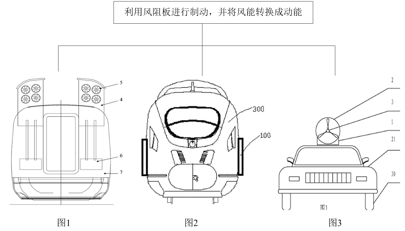 構件檢索式(TI=(風阻制動)) AND (IPC=((B61 OR B60)))在DOCDB、CNIPR就檢索到9件與該發(fā)明構思相同的專利,但是具體的實現(xiàn)方式不同,例如專利CN202944357U保護的技術方案如圖2所示,具體的“風阻制動裝置,包括風阻制動板和驅動機構,驅動機構包括驅動桿,驅動桿鉸接于風阻制動板,風阻制動板的一端交接于固定座,并由驅動桿驅動而可繞固定座轉動”。專利WO2012003631A1權利要求1保護的技術方案如圖3所示,具體的“包括車體、安裝在車體上的蓄電池、和右蓄電池提供電能的電動裝置、與蓄電池電連接的涵道風力發(fā)電裝置,隨車輛的快速行駛產(chǎn)生合流風進行風力發(fā)電,并將電能儲存在蓄電池內”。