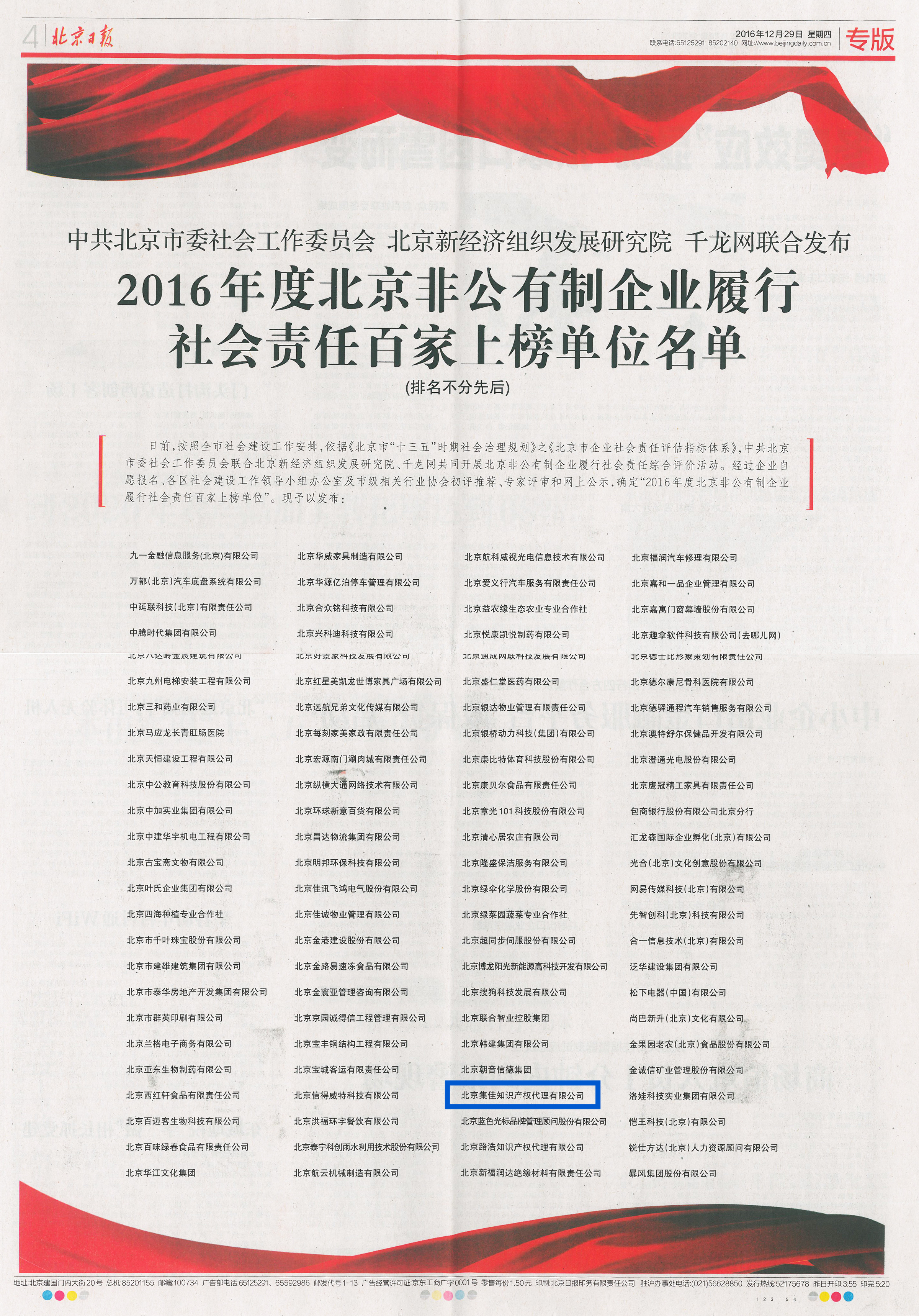 集佳入選“2016年度北京非公有制企業履行社會責任百家上榜單位”