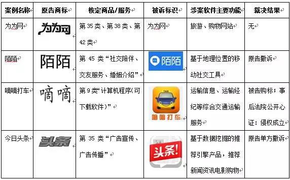 2014年8月上海市第一中級(jí)人民法院受理的上海易飾嘉網(wǎng)絡(luò)科技有限公司起訴上海沃商信息科技有限公司推出、蘋果APP Store分發(fā)的“為為網(wǎng)”APP侵害其第35類、38類、42類服務(wù)上注冊(cè)的“為為網(wǎng)”商標(biāo),索賠人民幣1億元,被業(yè)內(nèi)稱為首例(實(shí)際上,立案時(shí)間晚于杭州中院“嘀嘀打車”一案)移動(dòng)互聯(lián)網(wǎng)商標(biāo)侵權(quán)糾紛,由于雙方和解或其他原因,該案并未有判決做出。同樣,2014-2015年間,杭州陌陌婚慶服務(wù)有限公司以其在45類“社交陪伴、交友服務(wù)、婚姻介紹”等服務(wù)上注冊(cè)的“陌陌”商標(biāo),先后向北京市朝陽區(qū)人民法院、北京知識(shí)產(chǎn)權(quán)法院起訴北京陌陌科技有限公司停止“陌陌”軟件的下載服務(wù)并索賠1100萬元,后兩案均以原告撤訴結(jié)案。2014年5月,杭州妙影微電子有限公司、寧波市科技園區(qū)妙影電子有限公司訴北京小桔科技有限公司“嘀嘀打車”侵犯其第9類“計(jì)算機(jī)程序(可下載軟件)”上注冊(cè)的“嘀嘀”商標(biāo),索賠經(jīng)濟(jì)損失人民幣8000萬,2015年5月杭州市中級(jí)人民法院開庭審理了此案,2016年5月原告以適當(dāng)價(jià)格(據(jù)傳為人民幣300萬元)將其注冊(cè)商標(biāo)一并轉(zhuǎn)讓給被告后,原告撤訴。2016年6月北京博天恒業(yè)廣告有限公司向北京市西城區(qū)人民法院起訴稱,北京字節(jié)跳動(dòng)科技有限公司、北京字節(jié)跳動(dòng)網(wǎng)絡(luò)技術(shù)有限公司手機(jī)端“今日頭條”APP的名稱、圖標(biāo)以及PC端“頭條網(wǎng)站”侵犯其在第35類“廣告宣傳、廣告?zhèn)鞑ァ鄙虾藴?zhǔn)注冊(cè)的“頭條”商標(biāo),要求停止侵權(quán)、消除影響,并索賠高達(dá)人民幣1億元的經(jīng)濟(jì)損失,2016年11月,原告單方撤訴[2]。目前,涉及APP的商標(biāo)侵權(quán)糾紛案件,可資借鑒的判例主要有2014年1月東莞市中級(jí)人民法院審理的“115網(wǎng)盤”一案[3],2015年2月北京市海淀區(qū)人民法院審理的“滴滴打車”一案[4],2015年12月北京知識(shí)產(chǎn)權(quán)法院審理的“西柚”一案[5],2016年8月北京市海淀區(qū)人民法院審理的“楚楚街”一案[6],2016年9月北京市高級(jí)人民法院再審結(jié)案的“新浪拍客”一案[7],2017年4月杭州濱江區(qū)法院一審的“曹操專車”一案;而杭州中院雖未就“嘀嘀打車”一案做出判決,但主審法官在其文章中[8]公開了該案的審理思路,同樣具有重要的參考價(jià)值。