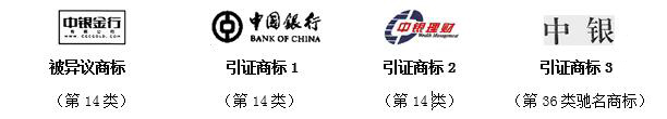 答辯理由和法律依據(jù):被異議商標(biāo)與引證商標(biāo)1/2構(gòu)成類似商品上的近似商標(biāo),同時構(gòu)成對第36類引證商標(biāo)3“中銀”馳名商標(biāo)的復(fù)制、摹仿,損害了異議人馳名商標(biāo)權(quán)益。違反了《商標(biāo)法》第十三條第三款和第三十條規(guī)定。