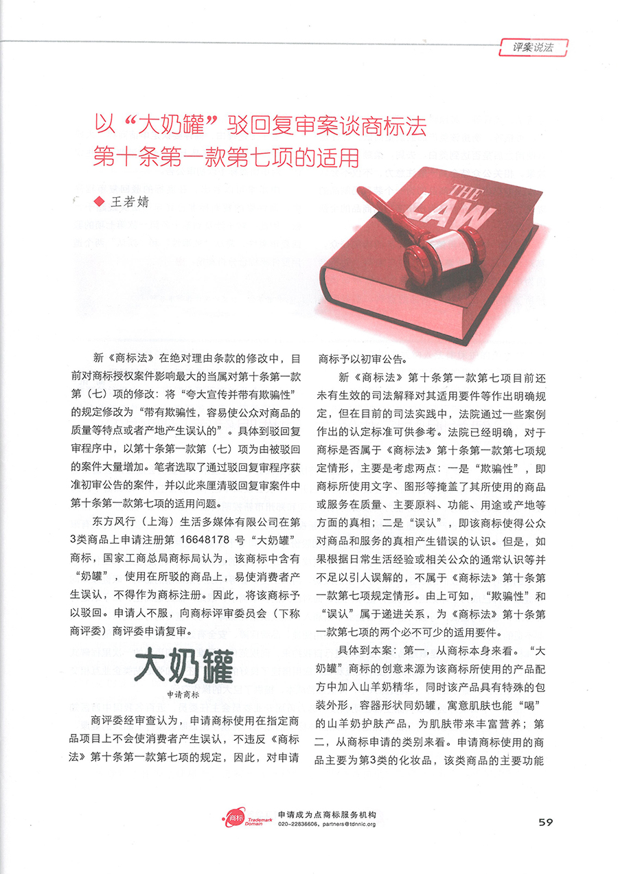 集佳文章《以“大奶罐”駁回復審案談商標法第十條第一款第七項的適用》在《中華商標》發表
