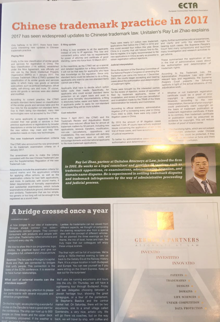 集佳合伙人趙雷文章在歐洲商標協會(ECTA)年會會刊 ECTA Daily 發表