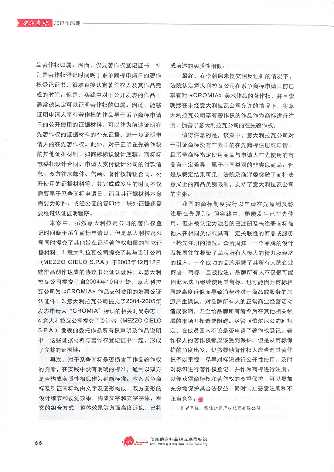 集佳文章《商標確權案中對在先著作權的認定及保護》在《中華商標》發表