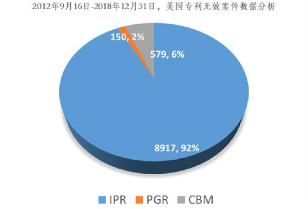 5、根據(jù)USPTO(美國專利商標(biāo)局)公布的2012年9月16日至2018年12月31日美國專利無效案件數(shù)據(jù),在IPR、PGR、CBMR三種無效(復(fù)議)程序中,IPR占比最多,高達92%,合計為8917件;IPR較少,占比僅為2%,合計150件。從目前的數(shù)據(jù)觀察,IPR是上述三種無效(復(fù)議)程序中最受歡迎的方式。