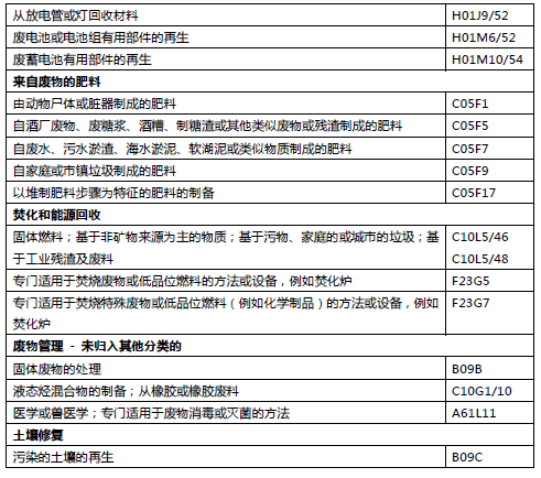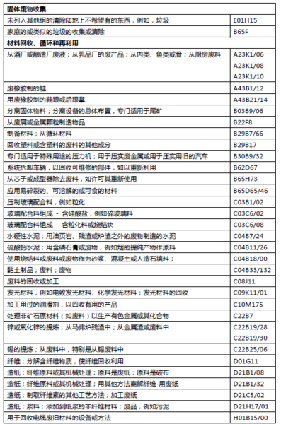 數(shù)據(jù)檢索在大為專利搜索進行,考慮到技術(shù)代表性和樣本范圍,選取中國發(fā)明專利數(shù)據(jù)庫,檢索條件根據(jù)經(jīng)濟合作與發(fā)展組織(OECD)環(huán)境相關(guān)問題的專利檢索策略【4】,選取固體廢物(下文中簡稱固廢)領(lǐng)域的相關(guān)IPC分類號進行整理,結(jié)果如表1所示。