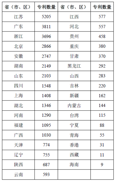 申請專利數(shù)量越多的省市,在該領(lǐng)域相對更加重視,也擁有更好的技術(shù)優(yōu)勢。從表2可知,申請量排名前五的省市依次為江蘇(5205件)、廣東(3811件)、浙江(3696件)、北京(2866件)和安徽(2747件),這五省市總計申請了18325件,占據(jù)分析專利總量的半壁江山(49.7%)。申請量前十的省市則占到了分析專利總量的72.9%(26879件),并且西部地區(qū)僅有四川(1548件)躋身申請量前十。