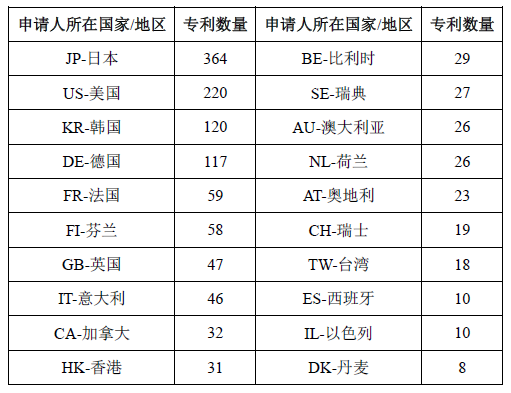 根據(jù)表3(僅列出申請量前20位的國家或地區(qū)),共有49個國家或地區(qū)在固廢領(lǐng)域在華進行了專利布局,共計1367件,僅占分析專利總量的3.5%左右,這表明該領(lǐng)域的專利申請人主要集中在國內(nèi)。隨著固廢領(lǐng)域技術(shù)的不斷發(fā)展,競爭的不斷加劇,市場的不斷發(fā)掘和擴大,相信國外主體也會越來越多地進行在華布局。