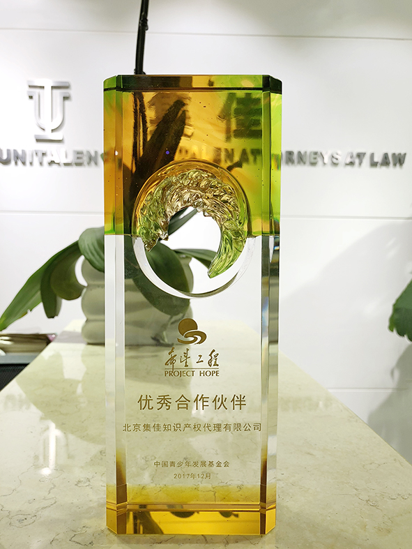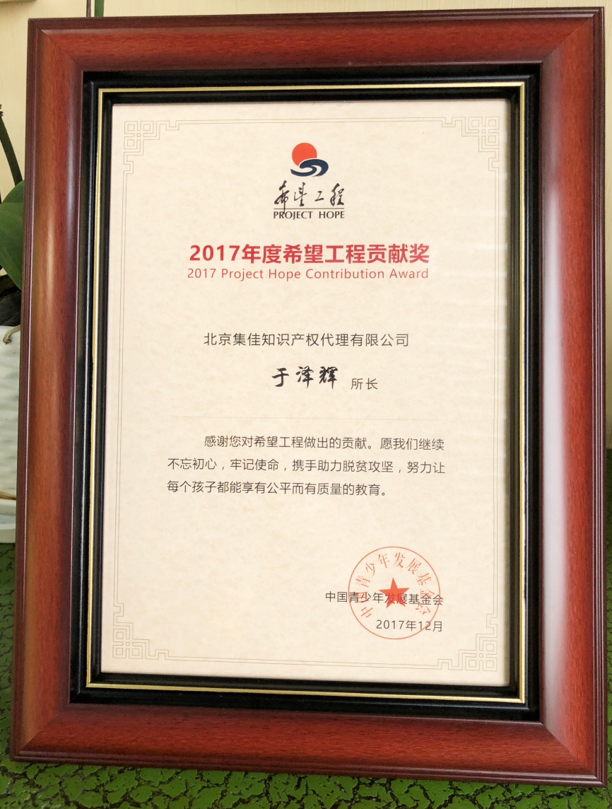近日,集佳收到了中國青少年發(fā)展基金會頒發(fā)的“希望工程優(yōu)秀合作伙伴”獎與“2017年度希望工程貢獻獎”,特別表彰于澤輝所長帶領集佳對希望工程作出的支持與貢獻。此外,青基會在《中國青年報》刊發(fā)整版感謝函,對包括集佳在內(nèi)的100多家單位和企業(yè)衷心致謝。