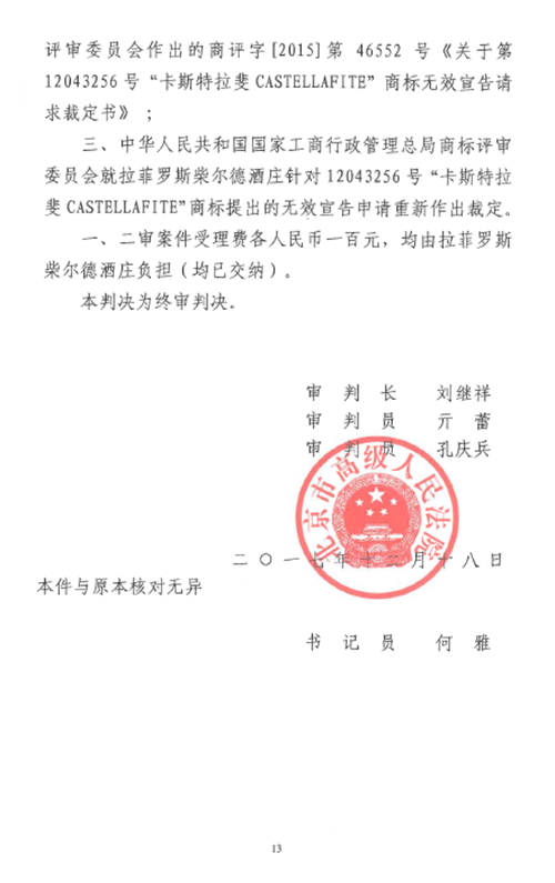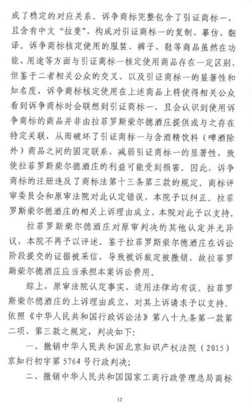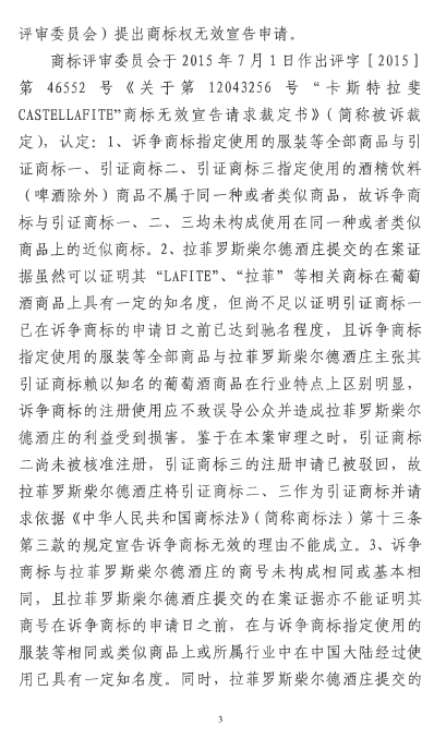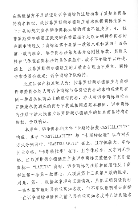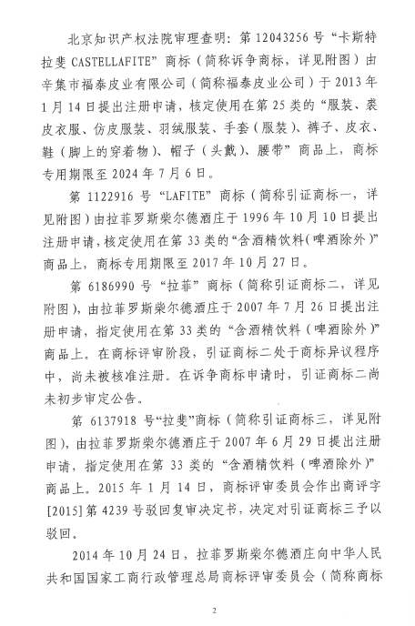 近日,北京市高級人民法院就 “卡斯特拉斐CASTEL LAFITE”商標(由辛集市福泰皮業有限公司在2013年1與14日申請注冊,核定商品為第25類服裝等)無效宣告一案,做出終審判決,認定法國拉菲羅斯柴爾德酒莊在33類酒類商品上在先注冊的“LAFITE”商標,確為公眾所熟知,已構成馳名商標;訴爭商標“卡斯特拉斐CASTEL LAFITE”完整包含了在先馳名商標“LAFITE”,且含有的中文“拉斐”是“LAFITE”常用的翻譯形式之一,因此訴爭商標構成了對引證馳名商標的復制、模仿或翻譯,破壞了引證商標與其標示商品之間的固定聯系,減弱了“LAFITE”商標的顯著性,使拉菲羅斯柴爾德酒莊的利益可能受損。據此,北京市高級人民法院判決撤銷一審判決及商評委裁定,并責令商評委重新作出裁定。