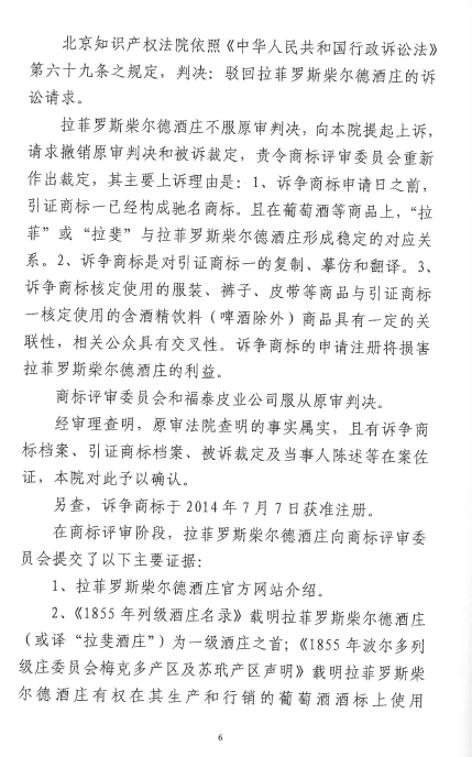 首個終審判決認定“LAFITE”葡萄酒馳名,跨類保護至服裝商品