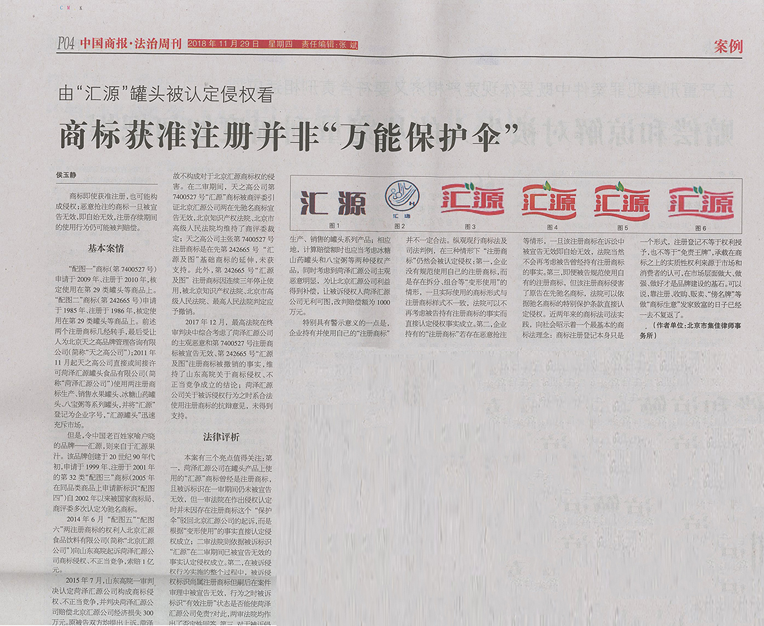 集佳文章《由“匯源”罐頭被認定侵權看商標獲準注冊并非“萬能保護傘”》在《中國商報》發表