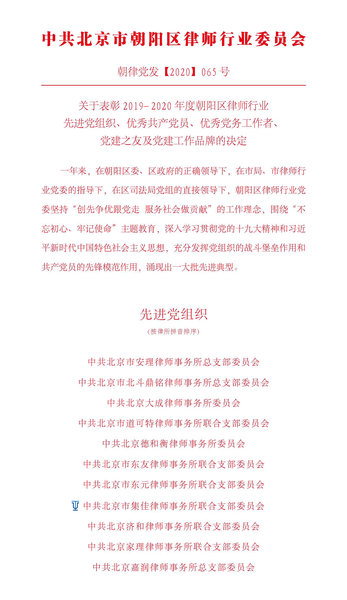 7月1日,在慶祝中國共產(chǎn)黨成立99周年之際,中共北京市朝陽區(qū)律師行業(yè)委員會下發(fā)文件表彰2019-2020年度朝陽區(qū)律師行業(yè)先進(jìn)黨組織及個人,集佳律所黨支部被授予“先進(jìn)黨組織”光榮稱號。