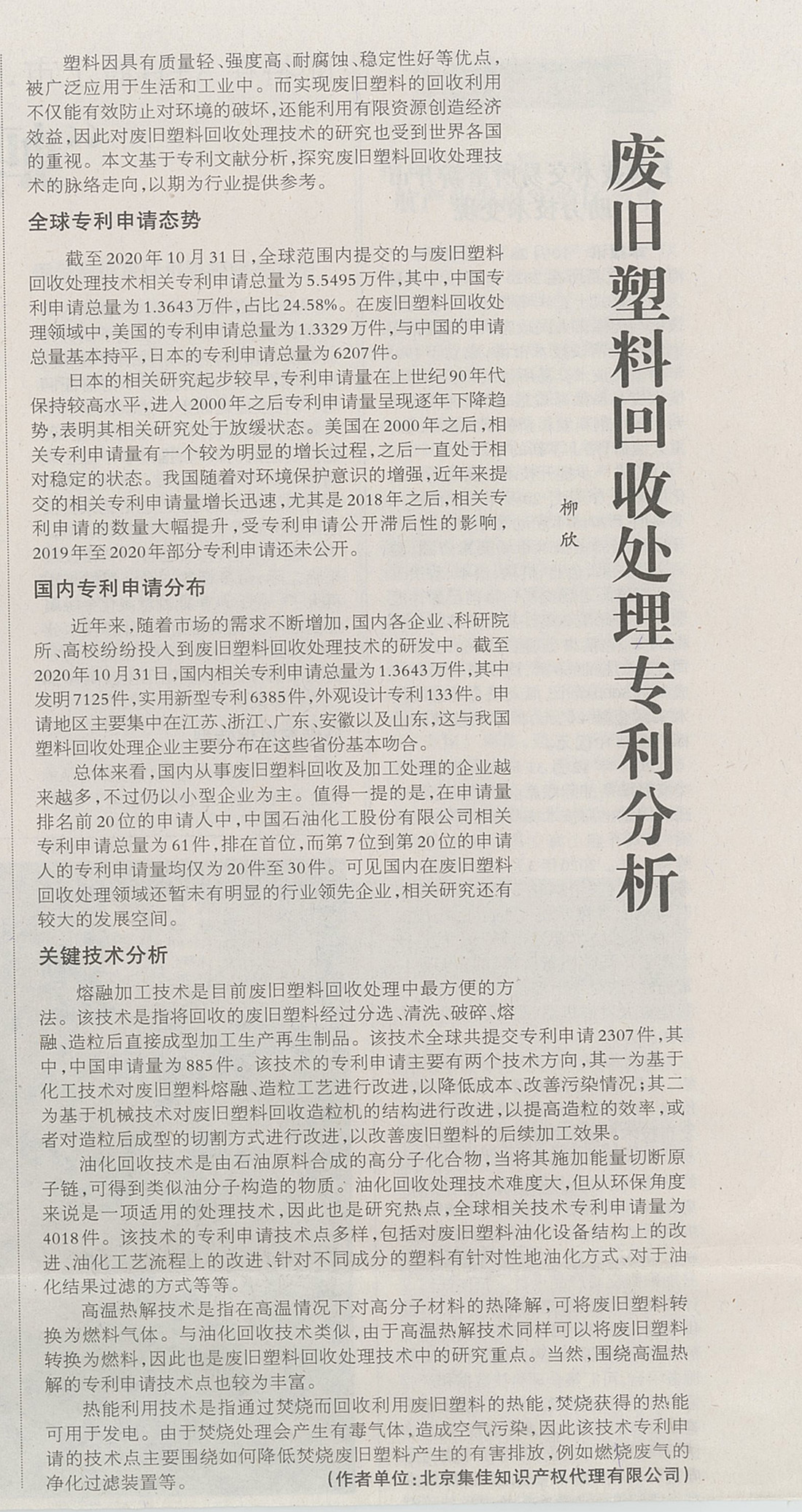 集佳文章《廢舊塑料回收處理專利分析》在《中國知識(shí)產(chǎn)權(quán)報(bào)》發(fā)表