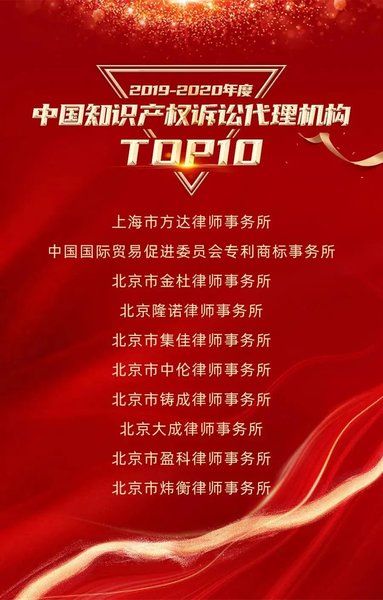 2020年12月2日,知識產(chǎn)權領域權威媒體知產(chǎn)力與知產(chǎn)寶重磅推出“2019-2020年度中國知識產(chǎn)權訴訟代理機構TOP 10”排行榜,北京市集佳律師事務所憑借其優(yōu)質(zhì)的服務、卓越的業(yè)務能力和處理疑難案件的突出能力,榮登TOP10榜單!