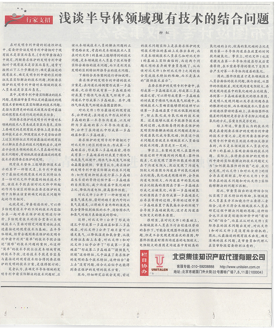 集佳文章《淺談半導體領域現有技術的結合問題》在《中國知識產權報》發表
