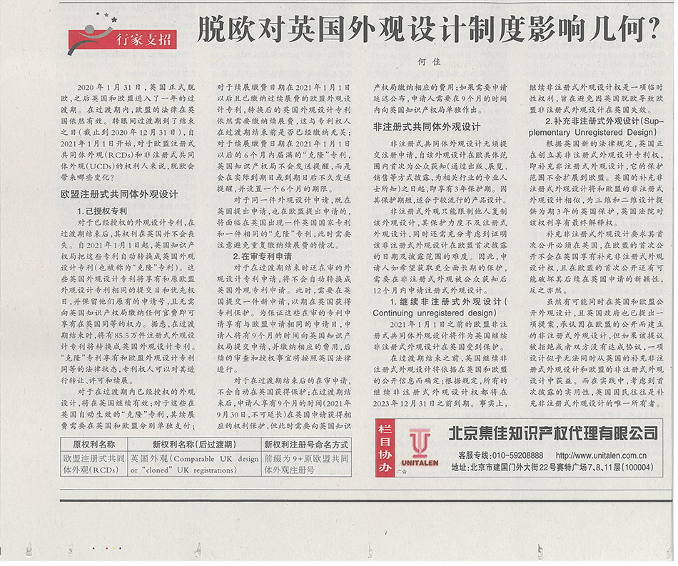 集佳文章《脫歐對英國外觀設(shè)計(jì)制度影響幾何?》在《中國知識產(chǎn)權(quán)報(bào)》發(fā)表