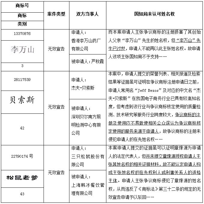 然而,在下述無效案件中,國知局并未對(duì)姓名權(quán)予以認(rèn)可,請(qǐng)見如下表格: