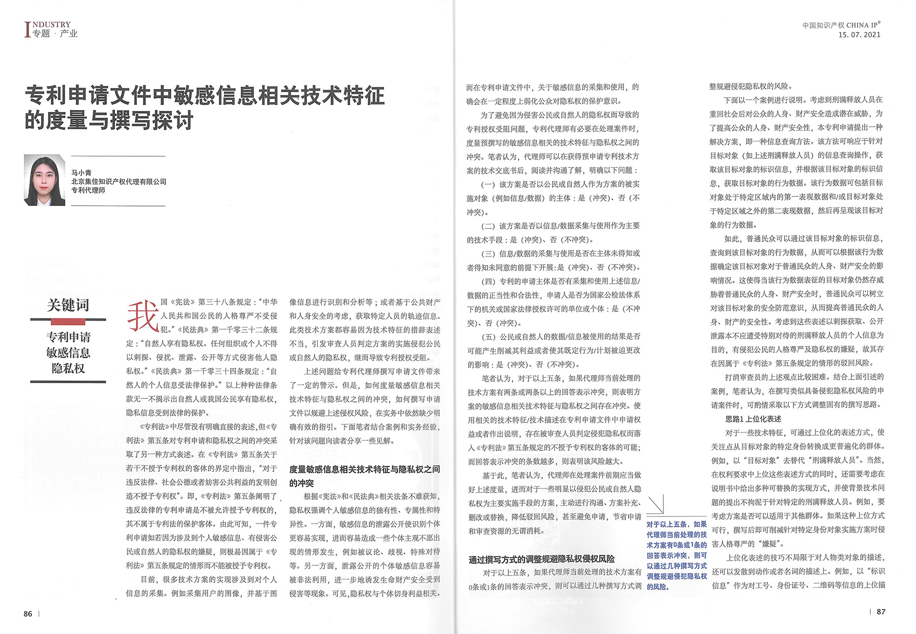 集佳文章《專利申請(qǐng)文件中敏感信息相關(guān)技術(shù)特征的度量與撰寫(xiě)探討》在《中國(guó)知識(shí)產(chǎn)權(quán)》發(fā)表