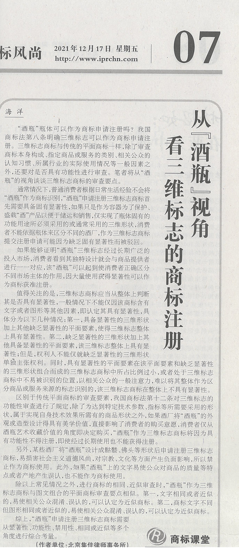集佳文章《從「酒瓶」視角看三維標(biāo)志的商標(biāo)注冊》在《中國知識產(chǎn)權(quán)報》發(fā)表