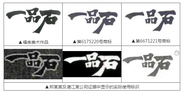 2007年7月,廣東省湛江市居民鄭某某在“電壓力鍋”等廚房器具商品上申請注冊第6175220號“一品石”商標(biāo),并于同年8月成立湛江市某公司。2008年4月,鄭某某又申請注冊另一枚第6671221號“一品石”商標(biāo),該枚商標(biāo)的字形與前一枚商標(biāo)略有變化,著作權(quán)圖樣及涉案相關(guān)標(biāo)識如下附圖所示: