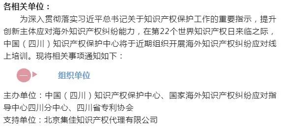 2022年4月20日,由中國(四川)知識產(chǎn)權(quán)保護中心、國家海外知識產(chǎn)權(quán)糾紛應對指導中心四川分中心、四川省專利協(xié)會主辦,北京集佳知識產(chǎn)權(quán)代理有限公司協(xié)辦的“中國企業(yè)如何有效應對海外專利糾紛”專題培訓線上分享會成功舉辦。