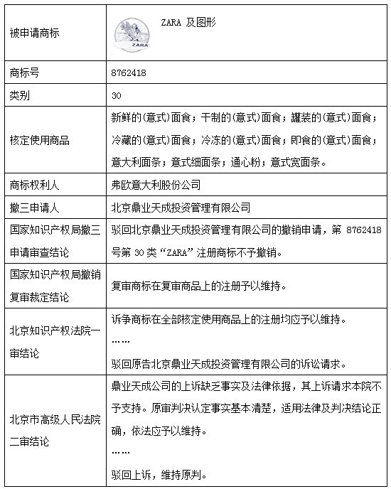 2019年01月15日,北京鼎業(yè)天成投資管理有限公司向國家知識產(chǎn)權(quán)局商標局提交撤銷三年不使用申請,申請撤銷弗歐意大利股份公司名下第8762418“ZARA及圖形”商標在第30類“新鮮的(意式)面食”等全部核定使用商品上的注冊。弗歐意大利股份公司在收到商標局下發(fā)的提供使用證據(jù)通知后,于規(guī)定期限內(nèi)提交了答辯理由及被申請商標在指定期限內(nèi)(即2016年01月15日至2019年01月14日)的使用證據(jù)。2019年08月27日,商標局經(jīng)審查,裁定被申請商標不予撤銷。