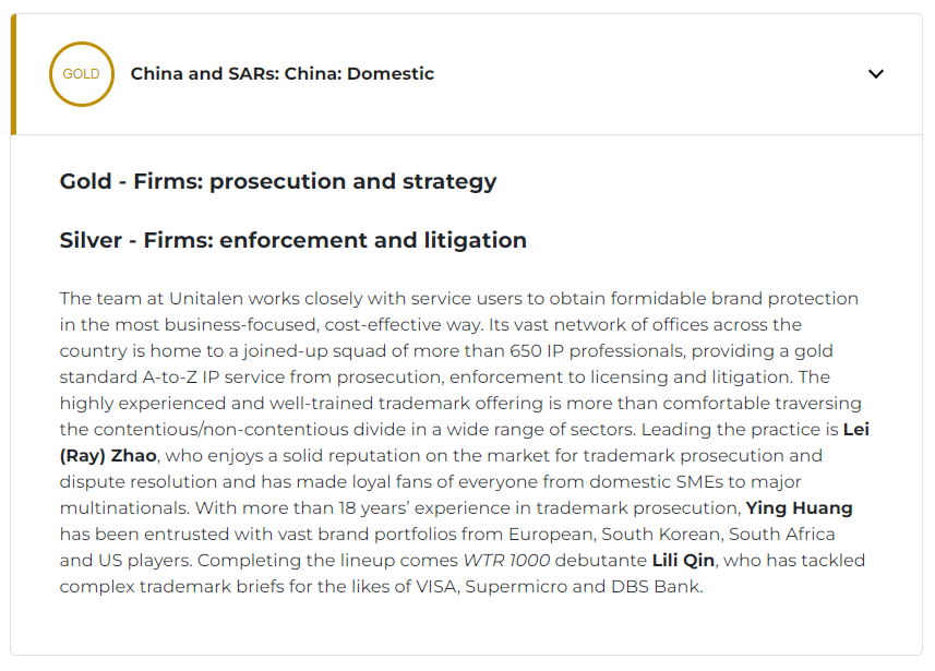 Recently, the authoritative international media in the field of intellectual property, the World Trademark Review (WTR), released a list of 2023 WTR 1000 global leading firms in the field of trademark. Unitalen, with its outstanding strength, was selected as the "Gold Medal Firm" in the field of trademark application and strategy and the "Silver Medal Firm" in the field of trademark protection and litigation in China. Meanwhile, attorney ZHAO Lei, Unitalen senior partner, was selected as a "Gold Medal Individual" in the field of trademark application and strategy and a "Silver Medal Individual" in the field of trademark protection and litigation in China. Attorney HUANG Ying, Unitalen Senior Partner, was selected as a "Bronze Medal Individual" in the field of trademark application and strategy in China. Attorney QIN Lili, Unitalen Partner, was selected as a "Bronze Medal Individual" in the field of trademark application and strategy and a "Bronze Medal Individual" in the field of trademark protection and litigation in China.