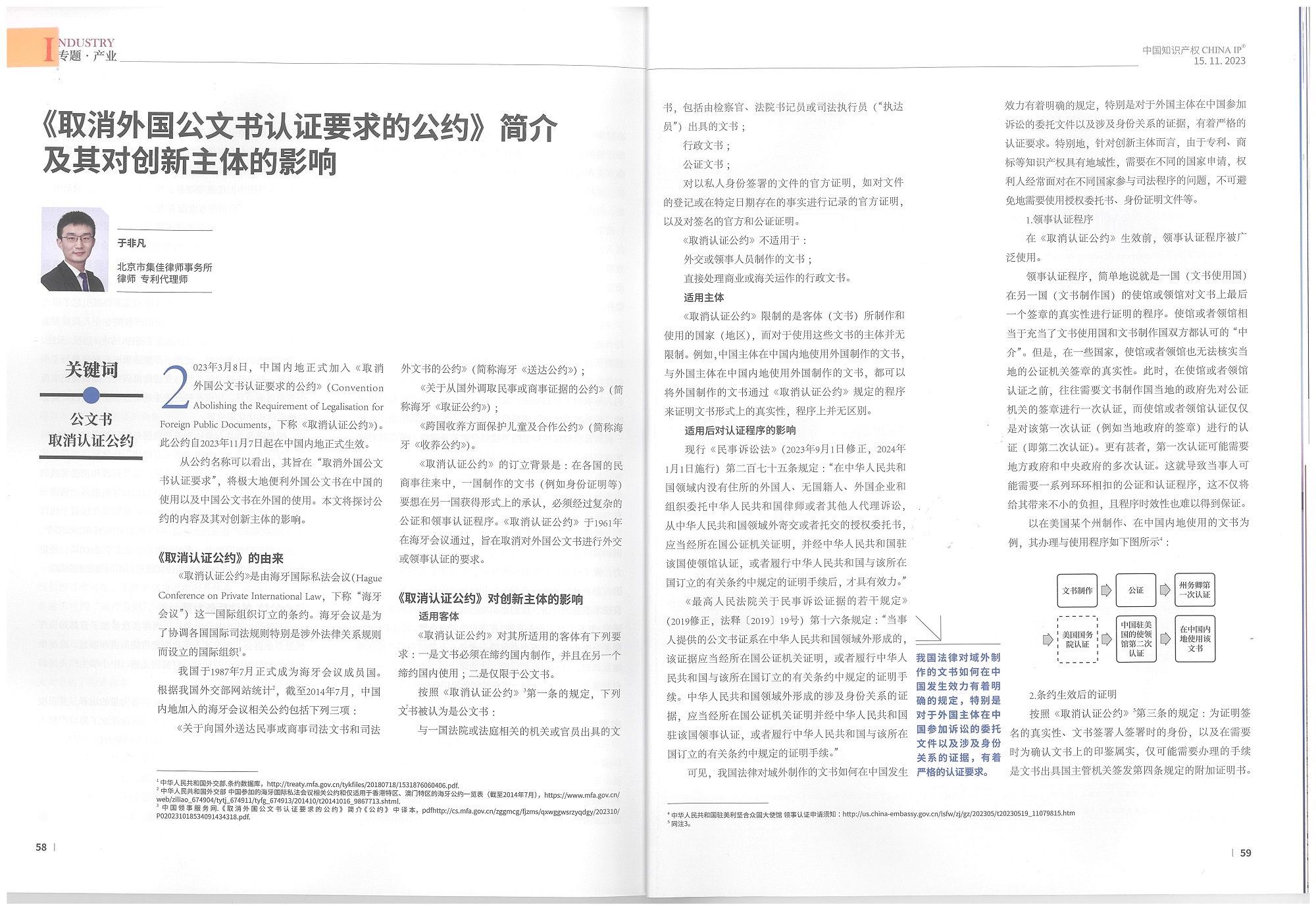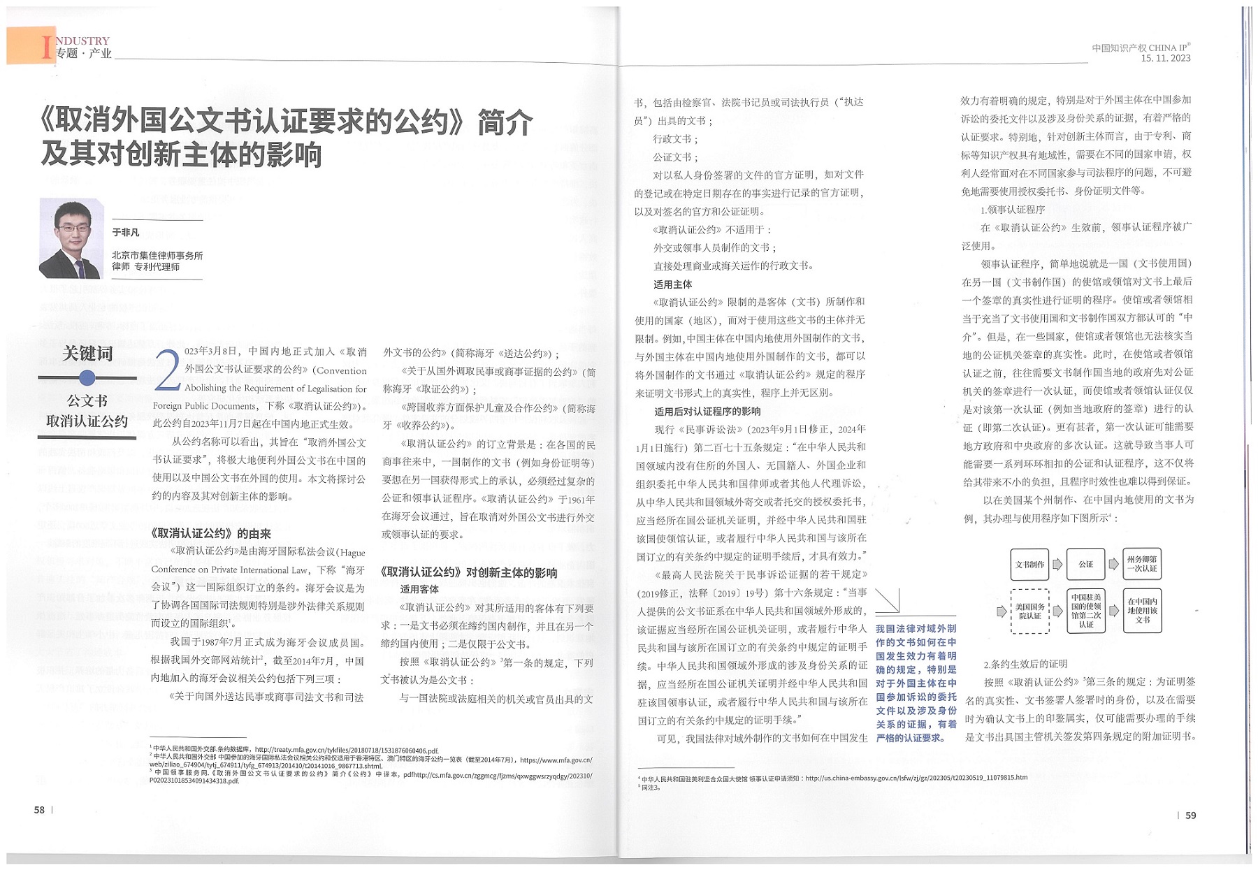 集佳文章《<取消外國公文書認證要求的公約>簡介及其對創新主體的影響》在《中國知識產權》發表