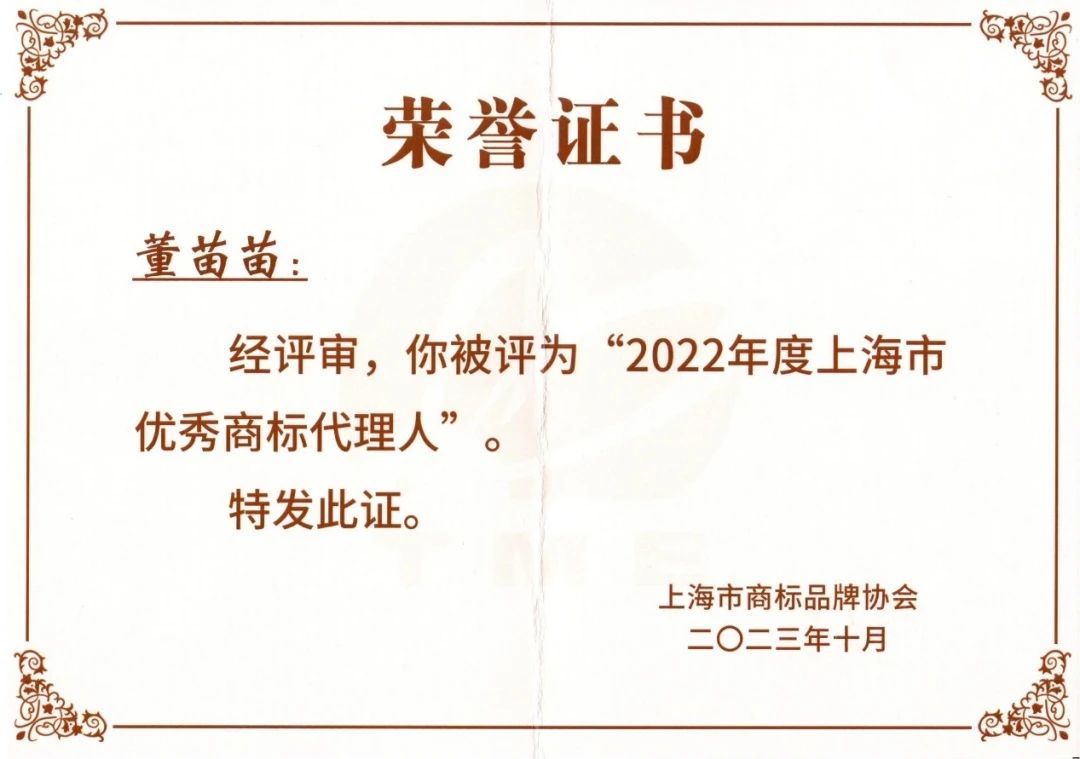 集佳上海分所董苗苗律師被評為2022年度“上海市優秀商標代理人”