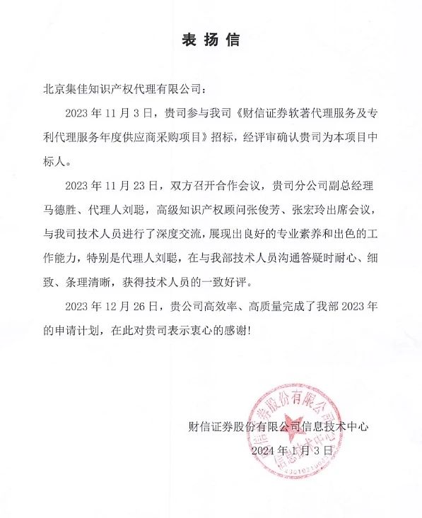 財(cái)信證券股份有限公司信息技術(shù)中心為集佳發(fā)來(lái)表?yè)P(yáng)信,贊揚(yáng)集佳長(zhǎng)沙分公司副總經(jīng)理馬德勝、代理人劉聰,高級(jí)知識(shí)產(chǎn)權(quán)顧問(wèn)張俊芳、張宏玲等,在為客戶(hù)提供專(zhuān)利代理服務(wù)的過(guò)程中展現(xiàn)出良好的專(zhuān)業(yè)素養(yǎng)與出色的工作能力,高效率、高質(zhì)量地幫助客戶(hù)完成了2023年專(zhuān)利申請(qǐng)計(jì)劃。特別是代理人劉聰,在與客戶(hù)技術(shù)人員溝通答疑時(shí)耐心、細(xì)致、條理清晰,獲得了技術(shù)人員的一致好評(píng)。