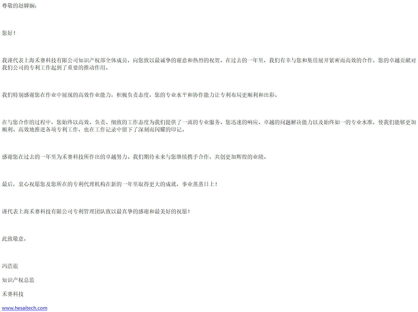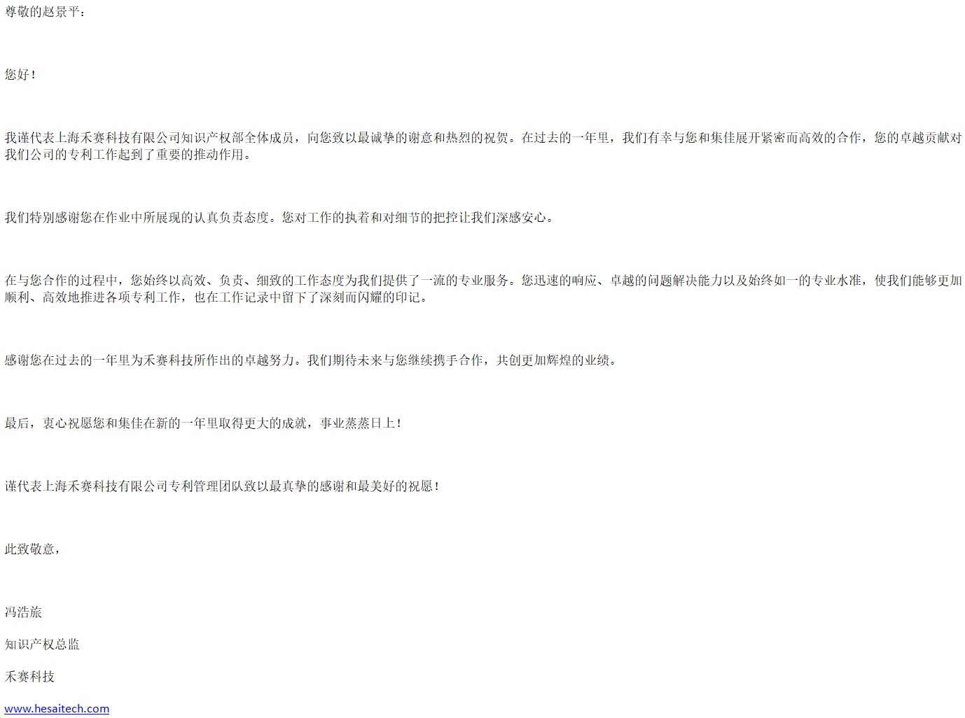 禾賽科技有限公司知識(shí)產(chǎn)權(quán)總監(jiān)馮浩旅致感謝信,稱(chēng)贊上海分所代理人趙嫭嫻趙景平以高效、負(fù)責(zé)、細(xì)致的工作態(tài)度為客戶(hù)提供了一流的專(zhuān)業(yè)服務(wù),在合作中展現(xiàn)了卓越的問(wèn)題解決能力以及始終如一的專(zhuān)業(yè)水準(zhǔn),協(xié)助客戶(hù)順利、高效地推進(jìn)各項(xiàng)專(zhuān)利工作。期待未來(lái)與集佳繼續(xù)攜手合作,共創(chuàng)更加輝煌的業(yè)績(jī)。