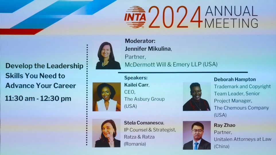2024年5月20日下午(美國亞特蘭大當?shù)貢r間),國際商標協(xié)會(INTA)146屆年會領導力專家論壇在美國亞特蘭大佐治亞世界會議中心順利舉行,集佳合伙人趙雷律師受邀出席,并就develop the leadership skills you need to advance your career主題,在美國律師Jennifer Mikulina女士主持下,與其他三位來自美國和羅馬尼亞企業(yè)的專家發(fā)表精彩演講與分享。
