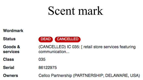 Verizon計劃將這種注冊商標的香味推廣到其線下旗艦店。根據申請書的記載,此香味有助于將這些地點與“日益擁擠的其他通信和消費電子產品零售商”區分開來。該氣味商標于2014年10月7日成為正式獲準注冊,該商標目前已經失效。