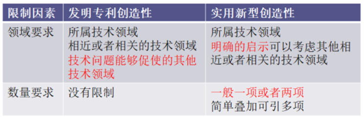 《專利審查指南》第四部分第六章第4節規定了實用新型專利創造性要求與發明專利有所不同,具體可以參見下表:
