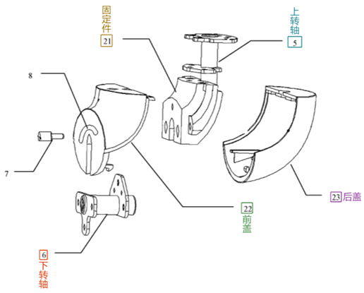 被訴決定認為:權利要求1相對于證據1的區別技術特征為:轉軸、下轉軸,所述上轉體與所述中轉體通過上轉軸轉動連接,所述中轉體與所述手柄通過下轉軸轉動連接,所述上轉軸與下轉軸垂直。實際解決的技術問題為:如何連接上轉體、中轉體和手柄并實現多角度調整。