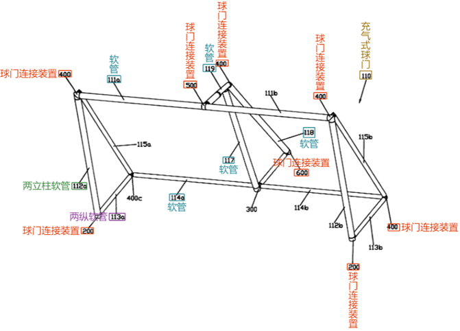“一種充氣式球門,其包括:若干軟管;若干球門連接裝置,所述球門連接裝置用于連接所述軟管;所述若干軟管連接成球門狀,其中,所述若干球門連接裝置中至少一個具有充/排氣閥,其特征在于:所述球門連接裝置進一步包括:至少兩個接頭,所述接頭前端具有倒齒;固套,所述固套放置于所述接頭中以支撐所述接頭;以及外環;所述外環套在所述倒齒上。”