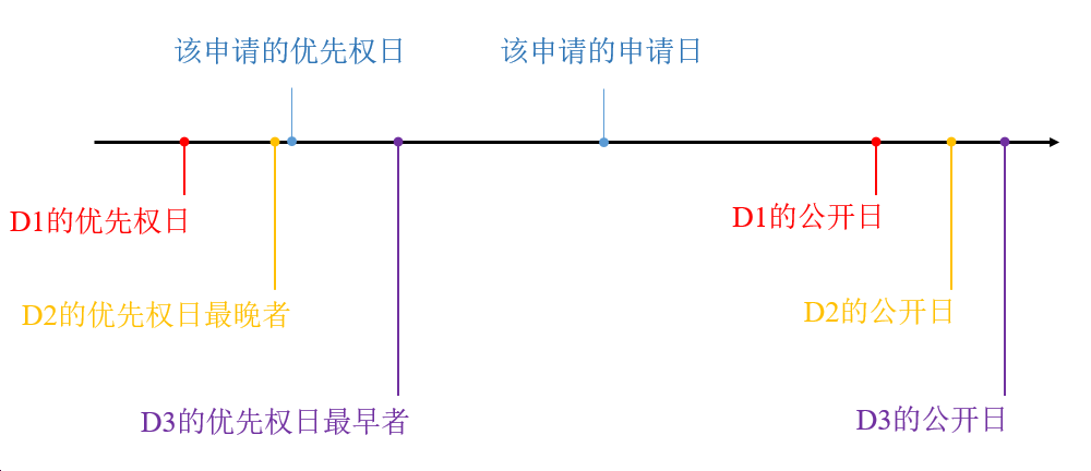 更具體而言,審查意見指出:D2的優先權日早于本申請優先權日(相關日期的比較參見下面的圖1),公開日晚于本申請優先權日,且公開了一個與本申請權利要求1的結構極為接近的化合物,區別僅在于是否被氘代,申請人在修改時可以考慮對比文件2的相關技術方案;D3的優先權日晚于本申請優先權日但早于本申請的申請日,其公開了一個落入本申請權利要求1范圍內的化合物,鑒于本申請優先權文件外文且非英文,審查員核實優先權存在障礙,申請人在針對本通知書進行修改時可以酌情考慮D3公開的相關技術方案。
