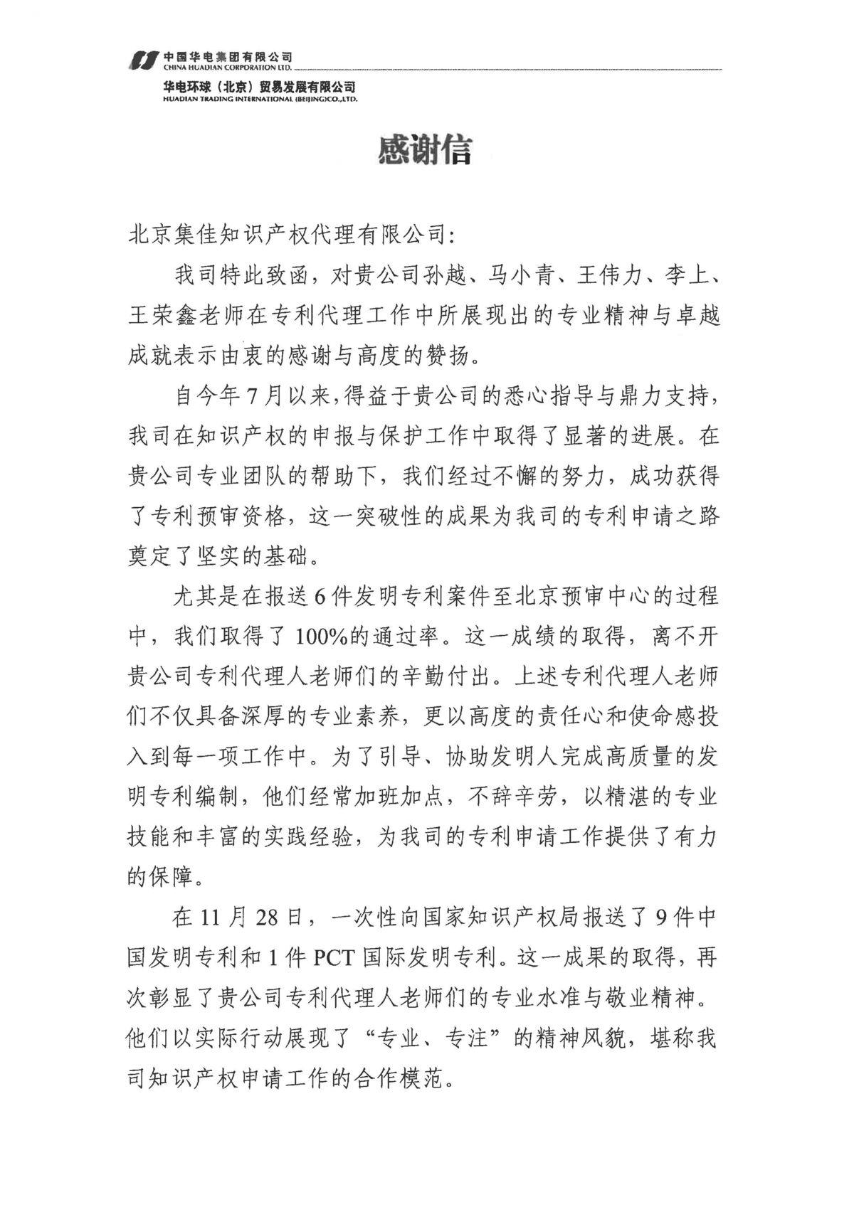 近日,集佳收到客戶華電環球(北京)貿易發展有限公司的感謝信,對集佳在知識產權申報與保護工作中給予的專業指導與大力支持表示由衷感謝,同時對集佳孫越馬小青王偉力李上王榮鑫等專業人員在專利代理工作中所展現出的專業精神與卓越成就表示高度贊揚!
