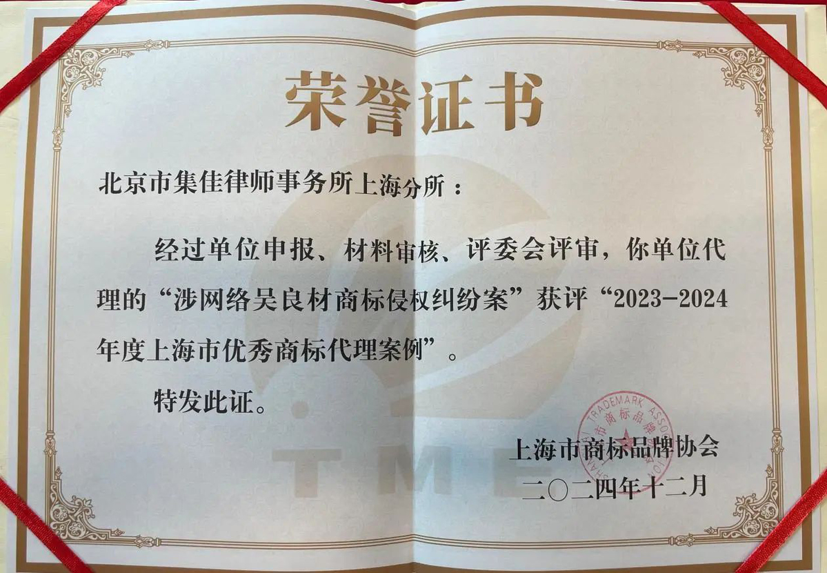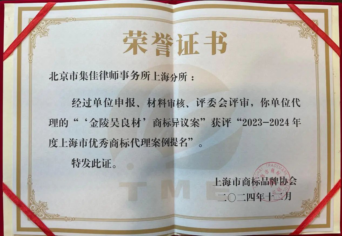 2025年1月7日,上海市商標品牌協(xié)會召開第六屆會員代表大會,會上表彰了被評為2023-2024年度“上海市優(yōu)秀商標代理案例”及“上海市優(yōu)秀商標代理案例提名”的案例,集佳上海分所的兩個案例成功入選
